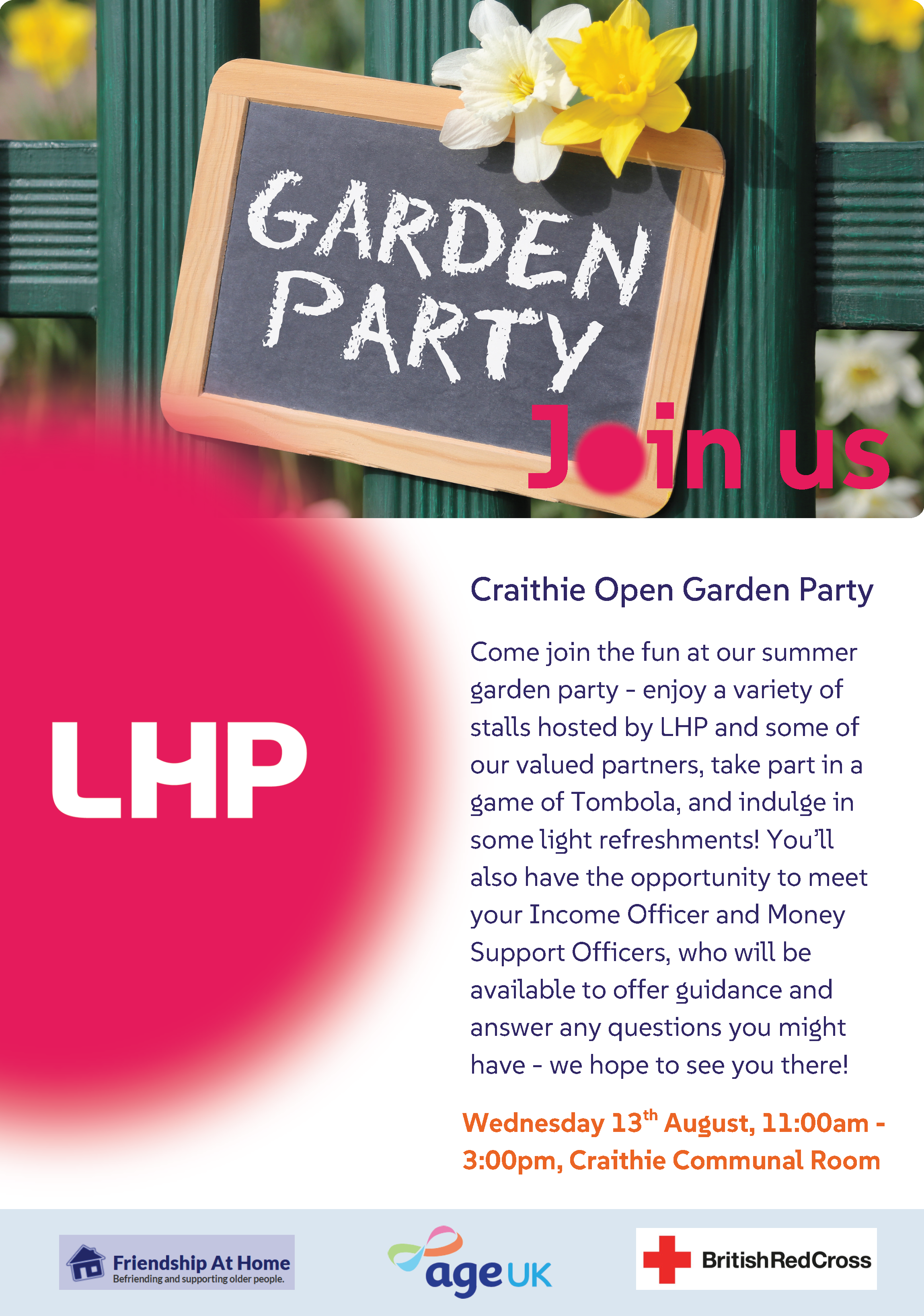 Working alongside LHP partners, Age UK, Friendship at Home and Red Cross, there will be a few stalls with interactive activities, light refreshments on offer and a game of Tombola for everyone to enjoy!